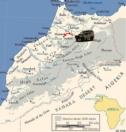 We turn off the coast road and head inland to Meknes. Again I'm navigating using the Lonely Planet town map. I know now to avoid the old town area, and try to get through to the campsite on the main roads. The campsite is vaguely marked on the map, as are the roads. We drive past an imposing gate on the left, and a market square on the right. Onwards we hit the local bus and coach station. Then we're heading out of town and we've obviously missed the camp site. A swift U-turn and we're heading back. I point at a road on the right. "Go down there!", I say, not really knowing why, just navigating by hunch again. Two turns later and there's the campsite.