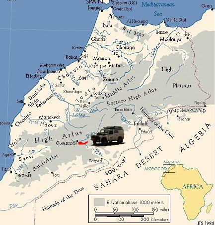 Eventually we hit the road for Ouarzazate. Now we're back on tarmac again. We stop for Mike to pick up some petrol, and some kids hassle us in Elsa. We teach them some rude english words for their troubles.
