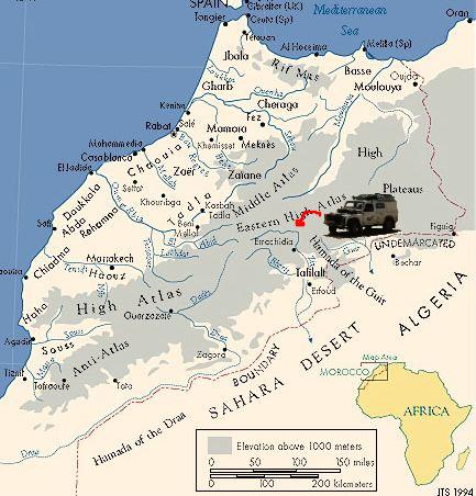 We are more than glad to get out of Erfoud. But its getting dark. We're heading up the Ziz valley and gorge but we're not seeing the scenery. Driving on these roads is dangerous - if not for us, then for the unlit cycles and mule carts that seem to appear out of nowhere in front of us. Eventually Sam has had enough, and we don't blame him. We pull over on a flat spot with rocks high up all around in the darkness. There's nowhere to put the tent so we all pile in and sleep.