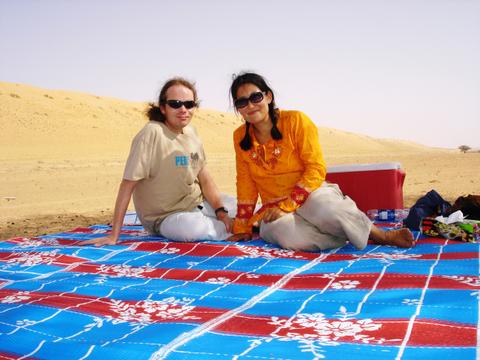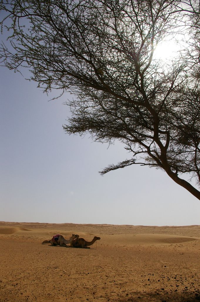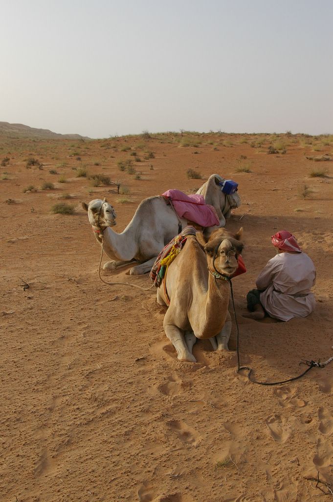 At lunchtime the Jeep appeared and we walked our camels over to the only visible tree for some shelter during lunch. The camels sat and rested while we dined on fine food. The rest was a welcome break, and I stretched and flexed my aching limbs. I was also taught how to tie my shemagh, or gutra, around my head. And yes, I am wearing a 'perl' t-shirt with a camel on it.