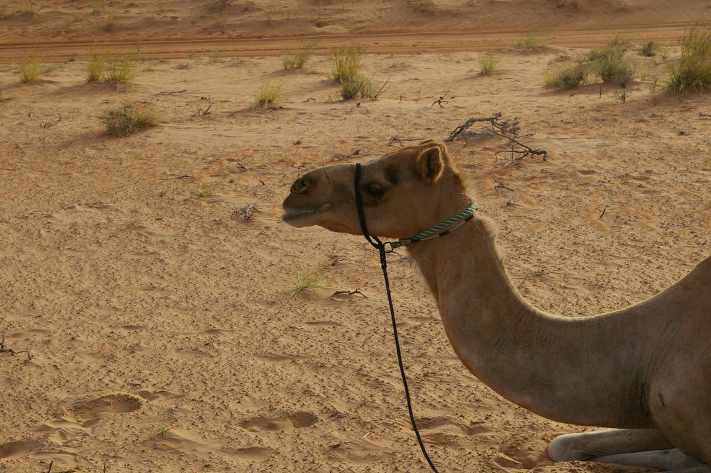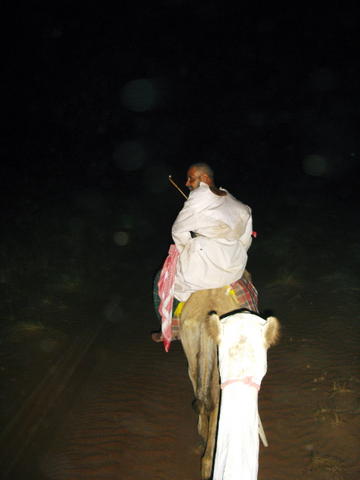 After two hours of this I was getting quite sore. My legs weren't meant to hang like this. I was glad I wasn't on the larger camel. I kept adjusting my position to try and get some relief. The desert scenery rolled on. We passed a desert holiday camp situated next to a giant red-and-white antenna mast. Over the next hill we were out of mobile phone range. By now I was also starting to get a bit sunburnt on my right leg as the sun was over that side of the camel. I had also drunk a bottle of isotonic drink and most of my Sigg bottle of water. I still had some cold water in a coolbox attached to my camel.