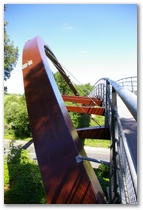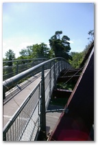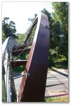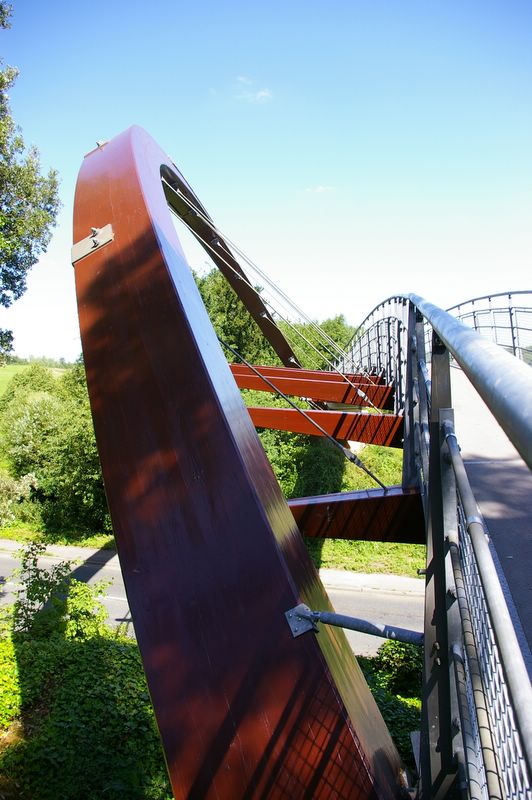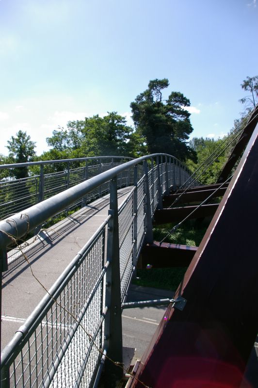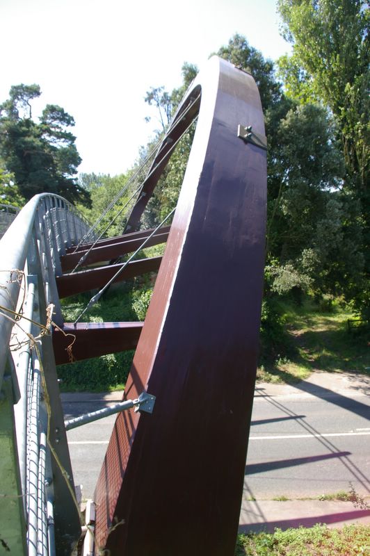 An old railway bridge crossing the road has been replaced by this elegant arched suspension bridge. It swings nicely when you rock it, and the lack of supports underneath make it seem an airy perch above the traffic.